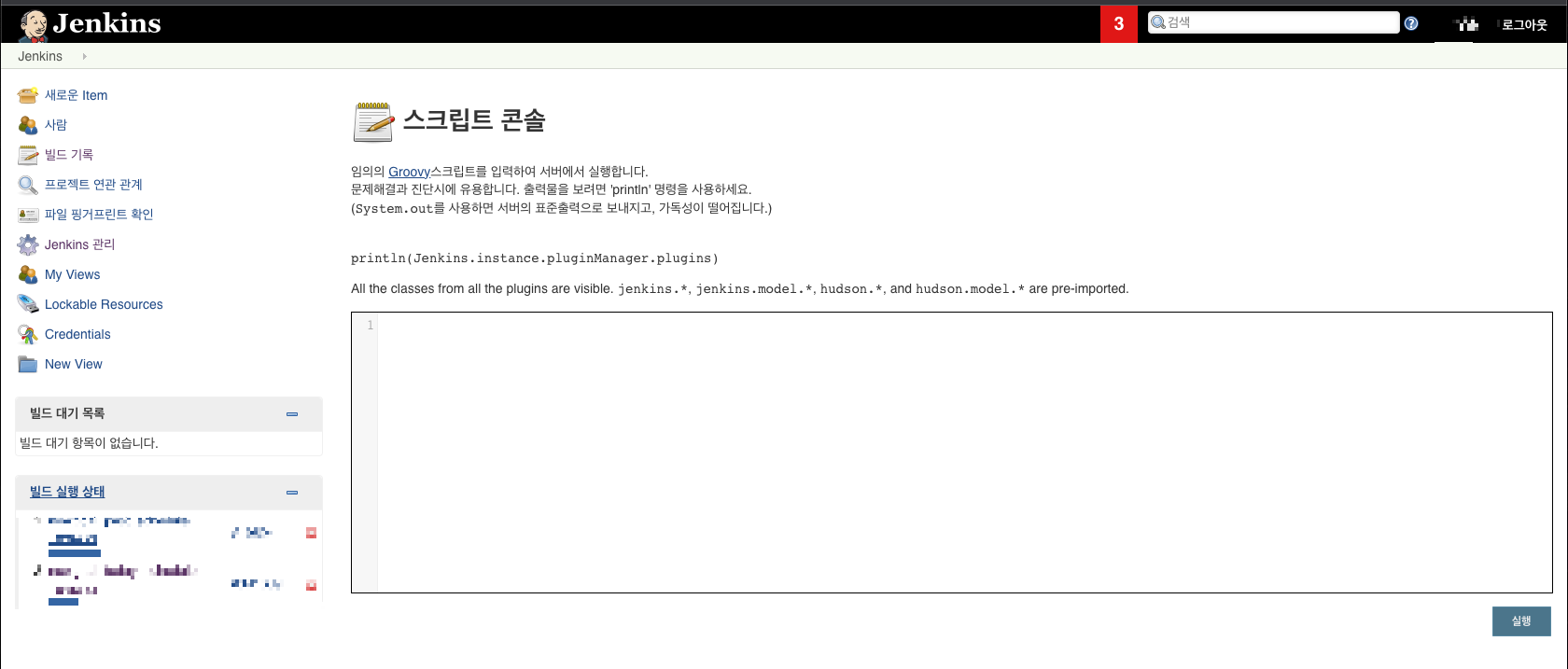 - Jenkins -> Jenkins 관리 -> Script Console 로 이동한다.