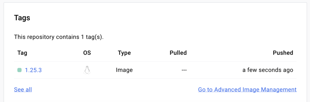 그럼 아래와 같이 nginx 이미지와 별도로 Tag 를 설정한 nginx 이미지 2개가 생성되었음을 확인 할 수 있다.